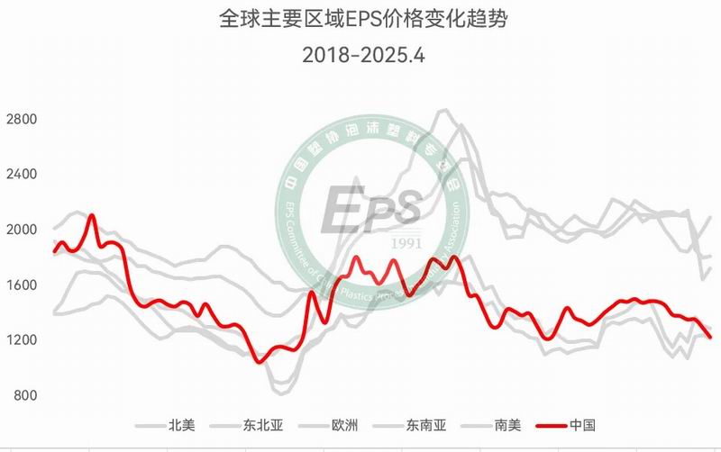 2025年4月,中國EPS珠粒均價約為1223美元/噸,環(huán)比下降5.3%(注:中國EPS價格以華東普通料出廠價為參考依據(jù))。2025年4月全球主要區(qū)域EPS價格和全球主要區(qū)域EPS價格變化趨勢分別如下: